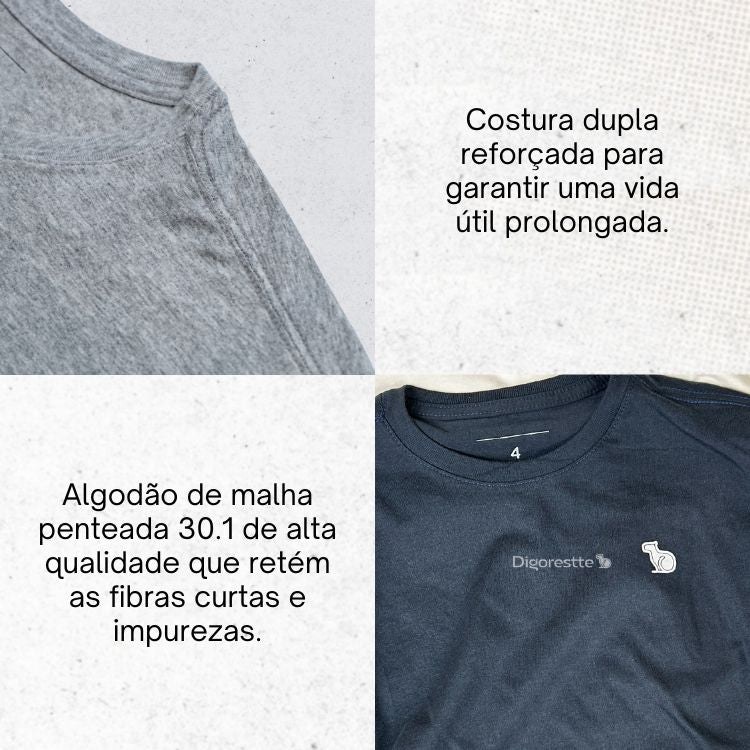 Desfrute do conforto das nossas peças fabricadas com algodão de malha penteada 30.1 de alta qualidade que retém as fibras curtas e impurezas aumentando sua durabilidade e resistência.